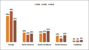 In 2022, the European market share was 49%, a decrease of 9 points compared to 2021, North America, primarily the USA, a share of 18%, an increase of 4 points compared to 2021, the Dutch Caribbean 16%, a decrease of 1 point compared to 2021 and South America 12%, an increase of 5 points over 2021.