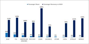 CAP is pleased with the overall performance of the airline partners servicing Curaçao throughout 2022. The following are the top producing airline partners based on passenger share and recovery vs 2019. See graph 3.